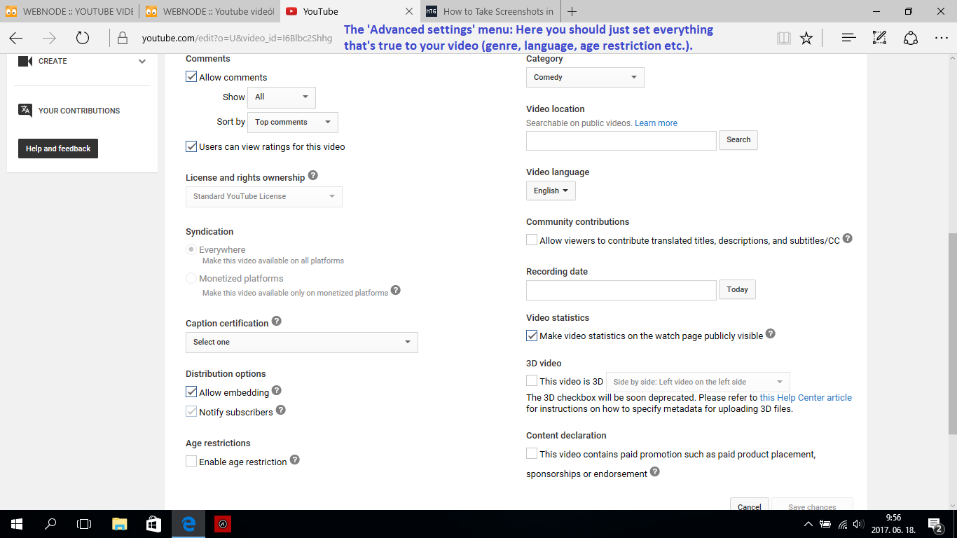 Important settings are: category, video language, comments, possible age restrictions.